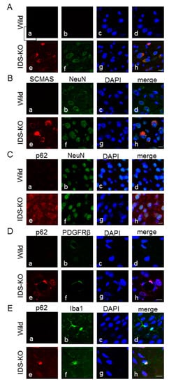 Subcellular localization of SCMAS in neurons was examined using immunoelectron microscopy with an SCMAS antibody. Normal-sized mitochondria were immunonegative, but hypertrophic mitochondria were immunopositive. The granules in large, single-membraned vacuoles in hypertrophic mitochondria were immunopositive for SCMAS (Figure 3B a–c). Also, lamellar or fingerprint-like structures in the cytoplasm were immunoreactive for SCMAS. That is, SCMAS immunoreactivity in neurons was found in vacuoles or fingerprint-like structures derived from mitochondria. Neurons without vacuoles were immunonegative. Subsequently, double immunofluorescence staining was performed to identify the cells immunopositive for p62 or SCMAS. The same cells were found to be immunopositive for SCMAS and p62, confirming that SCMAS-positive cells are also autophagy-positive (Figure 4A a–h). Double immunofluorescence staining with a combination of SCMAS and NeuN (a neuronal marker) or with p62 and NeuN also revealed double-positive cells, confirming the presence of autophagy in neurons in IDS-KO mice at six months of age (Figure 4B,C a–h). Double immunofluorescence staining with p62 and platelet-derived growth factor beta receptor (PDGFR-β) (a pericyte marker) confirmed autophagy of pericytes (Figure 4D a–h). Similarly, double immunofluorescence staining of p62 and iba1 (a microglial marker) confirmed autophagy of microglia (Figure 4E a–h).
