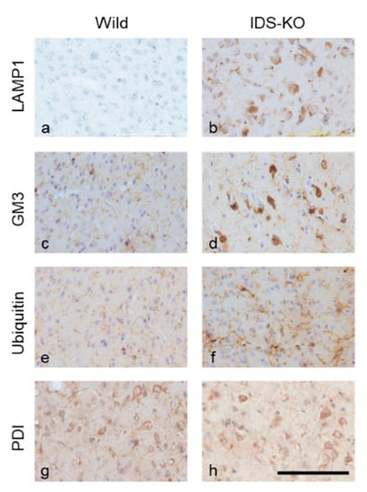 Changes in autophagy-related proteins were examined in IDS-KO and wild-type mice at six months of age. The number of cells in the cerebrum positive for lysosomal associated protein 1 (LAMP 1) was higher in IDS-KO than in wild-type mice (Figure 5a,b). Similarly, IDS-KO mice had more cells immunopositive for GM3 ganglioside (Figure 5c,d). The microglia were strongly positive for ubiquitin (Figure 5e,f), suggesting that the ubiquitin–proteasome system was enhanced. Protein disulfide isomerase (PDI) immunostaining did not differ between the KO and wild-type mice, suggesting no substantial enhancement of the ER stress response (Figure 5g,h).