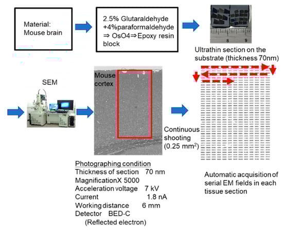 Scanning electron microscopic images of the brain specimens were obtained using a backscattered electron detector (BED-C; voltage, 7 kV; PC current, 1.8 nA; work distance, 6) in a JSM-7800F SEM (JEOL, Tokyo, Japan).