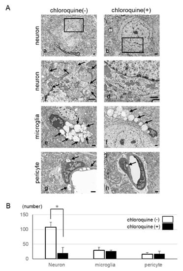 Therapeutic effect of orally administered chloroquine in the cerebral cortex. (A) Electron micrographs of the cerebral cortex with or without chloroquine treatment: Representative images of neurons (a,c), microglia (e), and pericytes (g) in the cerebral cortex of untreated mice. Representative images of neurons (b,d), microglia (f), and pericytes (h) in the cerebral cortex of treated mice. Fewer cytoplasmic vacuoles (arrows) were seen in the neurons after chloroquine treatment than in the untreated group. Panels c and d show magnified views of areas indicated by black rectangles in a and b, respectively. Bar = 1 μm. (B) Changes in the number of cells with vacuoles in the cytoplasm with and without the oral administration of chloroquine. The number of neurons showing vacuolation was markedly decreased after the oral administration of chloroquine. However, the number of microglia and pericytes did not change. * p < 0.05.