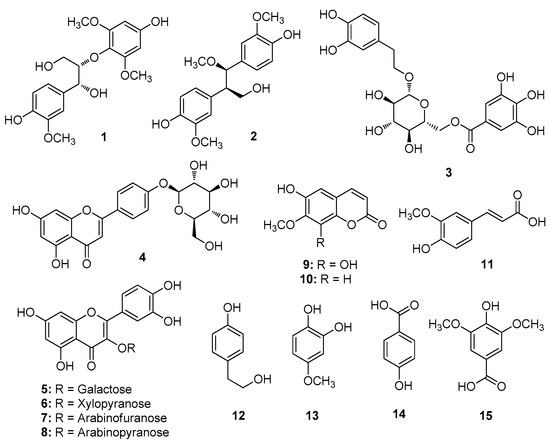 The isolated compounds were identified as (7S,8R)-1′,4-dihydroxy-3,3′,5′-trimethoxy-7′,8′,9′-trinor-8,4′-oxyneoligna-7,9-diol (1) [32], 4,4′-((1R,2R)-3-hydroxy-1-methoxypropane-1,2-diyl)-bis-2-methoxyphenol (2) [33], 1-O-β-d-(6′′-O-galloyl)-glucopyranoside (3) [34], naringenin-4′-O-β-d-glucopyranoside (4) [35], hyperoside (5) [36], quercetin 3-β-d-xylopyranoside (6) [37], avicularin (7) [38], guaijaverin (8) [39], 6,8-dihydroxy-7-methoxy-2H-1-benzopyran-2-one (9) [40], 6-hydroxy-7-methoxy-2H-1-benzopyran-2-one (10) [41], (E)-ferulic acid (11) [42], 4-hydroxy-benzeneethanol (12) [43], 2-hydroxy-4-methoxyphenol (13) [44], 4-hydroxy-benzoic acid (14) [45] and syringic acid (15) [46] by comparing their NMR spectroscopic and physical data with those reported in the literature, and by measuring their specific rotations as well as via LC/MS analysis.