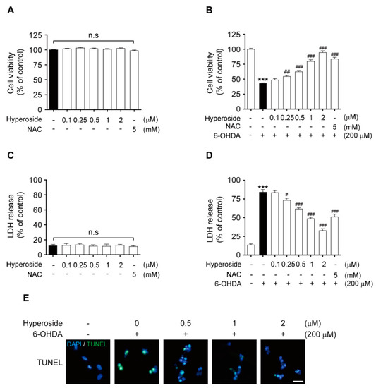 Figure 2. Effects of hyperoside on SH-SY5Y cells (A and C). Cells were pretreated with the indicated concentrations of hyperoside or N-acetylcysteine (NAC) for 24 h. Hyperoside protects against 6-hydroxydopamine (6-OHDA)-induced cell death (B) and lactate dehydrogenase (LDH) release (D) in SH-SY5Y cells. Cells were pretreated with the hyperoside (0.1–2 μM) or NAC (5 mM) for 4 h and then exposed to 200 μM 6-OHDA for 24 h. Error bars indicate the mean ± the standard error of the mean (SEM) (n = 6). Hyperoside prevents 6-OHDA-induced DNA fragmentation (E). DNA fragmentation was assayed using terminal deoxynucleotidyl transferase dUTP nick end labeling (TUNEL) staining. Cells were pretreated with the hyperoside (0.5–2 μM) for 4 h and then exposed to 200 μM 6-OHDA for 24 h. Images shown are representative of three experiments and visualized by fluorescence microscopy (20×). *** p < 0.001 vs. the control group. # p < 0.05, ## p < 0.01 and ### p < 0.001 vs. the 6-OHDA-treated group. n.s.: not significant. Scale bar: 200 μm.