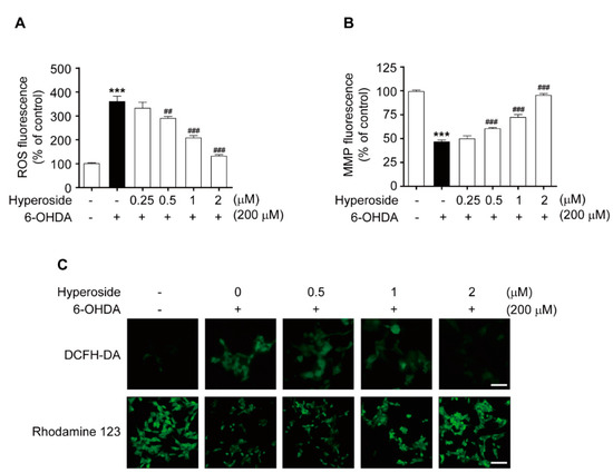 Figure 3. Hyperoside prevents 6-OHDA-induced intracellular Reactive Oxygen Species (ROS) accumulation (A,C, upper) and mitochondrial membrane potential (MMP) dysfunction (B,C, bottom) in SH-SY5Y cells. Representative images were observed under fluorescence microscopy (20×). Cells were pretreated with the hyperoside (0.25–2 μM) for 4 h and then exposed to 200 μM 6-OHDA for 1 or 24 h. Error bars indicate the mean ± SEM (n = 6). Images shown are representative of three experiments and visualized by fluorescence microscopy (40×). *** p < 0.001 vs. control group. ## p < 0.01 and ### p < 0.001 vs. the 6-OHDA-treated group. Scale bar: 200 μm.