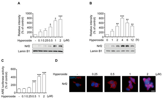 Figure 4. Hyperoside activates nuclear translocation of Nrf2 in SH-SY5Y cells. Hyperoside-induced Nrf2 activation is of a concentration- (A) and time-dependent (B) manner in SH-SY5Y cells. Cells were treated with hyperoside at the indicated times (0–12 h) and concentrations (0.1–2 μM), after which nuclear fractions were prepared to analyze the distribution of Nrf2. Levels of Nrf2 and laminin B1 were evaluated by Western blot analysis. Cells were transiently transfected with an ARE reporter plasmid construct and then treated with the indicated concentrations of hyperoside for 4 h. Equal amounts of cell extracts were assayed for dual-luciferase activity (C). Nrf2 was detected using an anti-Nrf2 antibody and a Texas red®-conjugated secondary antibody. Nuclei were stained with Hoechst 33258. Images shown are representative of three experiments and were captured using a fluorescence microscope (D, 100× magnification). Error bars indicate the mean ± SEM (n = 3). * p < 0.05, ** p < 0.01, and *** p < 0.001 vs. control group. Scale bar: 50 μm.