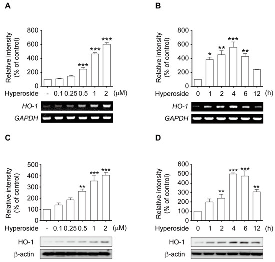 Figure 5. Hyperoside activates Nrf2-mediated HO-1 transcriptional induction in SH-SY5Y cells. Treatment with hyperoside induced the expression of HO-1 in a concentration-dependent manner (A,C). Cells were treated with hyperoside (0.1–2 μM) for 4 h or 6 h, and total mRNA and protein expression was analyzed by RT-PCR and Western blot analysis, respectively. Hyperoside induced the expression of HO-1 in a time-dependent manner (B,D). Cells were treated with 2 μM hyperoside for 0, 1, 2, 4, 6 and 12 h, and the total RNA and protein expression was analyzed by RT-PCR and Western blot analysis. Expression levels of HO-1, β-actin and glyceraldehyde 3-phosphate dehydrogenase (GAPDH) were evaluated by Western blotting and RT-PCR analysis. Error bars indicate the mean ± SEM (n = 3). * p < 0.05, ** p < 0.01, and *** p < 0.001 vs. the control group.