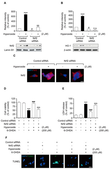 Figure 6. Nrf2 gene knockdown eliminated the neuroprotective effects of hyperoside on Nrf2-mediated HO-1 transcriptional induction. Cells were transiently transfected with an Nrf2 siRNA, as described in the Material and Methods, and then treated with or without 2 μM hyperoside for 4 h prior to exposed to 200 μM 6-OHDA for 24 h. Levels of Nrf2 (A), HO-1 (B), and β-actin were evaluated by Western blot analysis. Error bars indicate the mean ± SEM (n = 3). *** p < 0.001 vs. the (−) control siRNA group. # p < 0.001 vs. (+) control siRNA group. && p < 0.01 vs. the (+) Nrf2 siRNA group. Knockdown of Nrf2 abolished the neuroprotective effects of hyperoside on cell death (D) and LDH release (E) induced by 6-OHDA. Cells were transiently transfected with the siRNA Nrf2 plasmid construct and then treated with 2 μM hyperoside for 4 h, followed by exposure to 200 μM 6-OHDA for 24 h. Cells were pretreated with the indicated concentrations of hyperoside for 4 h. Nrf2 was detected using an anti-Nrf2 antibody and a Texas red®-conjugated secondary antibody (C, 100× magnification, scale bar: 50 μm). DNA fragmentation was assayed using TUNEL fluorescent dye (F). Nuclei were stained with Hoechst 33258. Images shown are representative of three experiments and were visualized by fluorescence microscopy. Error bars indicate the mean ± SEM (n = 6). ***p < 0.001 vs. the control group. ### p < 0.001 vs. the 6-OHDA-treated group. && p < 0.01 and &&& p < 0.001 vs. the 6-OHDA plus sieboldin-treated group. Scale bar: 100 μm.