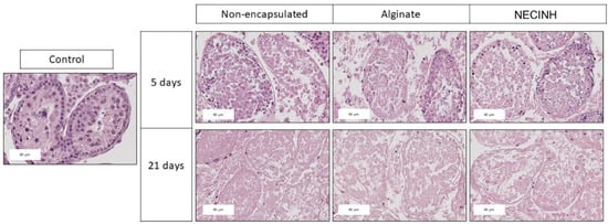 Our results confirm that our strategy has a relevant potential for further studies involving human tissue. The testicular tissue transplantation experiments with alginate hydrogel and VEGF NPs [] and here with NECINH-NPs represent a paradigm for future applications of tissue engineering procedures applied to fertility preservation and other fields of regenerative medicine.