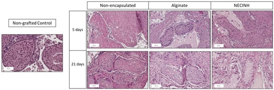Five days after transplantation, significantly more MDA-positive cells were observed for non-encapsulated tissue compared to both tissue encapsulated in alginate (p = 0.0073) and alginate with NECINH-NPs (p = 0.0132) (Table 3, Figure 9). After 21 days of grafting, no difference between the three conditions was found (Table 3, Figure 9).