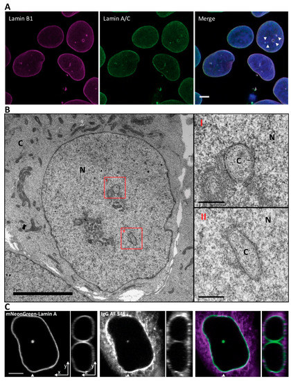 Nuclei of Ishikawa cells contain invaginations of the nuclear envelope forming a nucleoplasmic reticulum. (A) Ishikawa cells immunostained with anti-Lamin B1 and anti Lamin A/C. Scale bar 5 µm. (B) Electron microscopy micrograph of a high-pressure frozen Ishikawa cell. Scale bar is 5 µm for low magnification nucleus and 0.5 µm for high magnification insets. N, nucleus; C, cytoplasm. (C) Cytoplasmic loading by IgG AF 546 to visualize the cytoplasmic core of the invagination. Arrowhead indicates position of orthogonal projection in the panels to the right. Scale bar 5 µm.