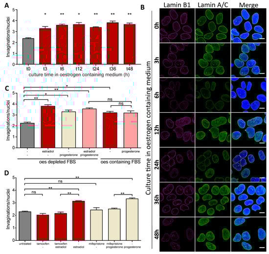Progesterone added to the cell culture medium, similar to oestrogen, increased the mean number of NR invaginations per nucleus, however there was no synergistic effect of treatment with both hormones (Figure 2C).