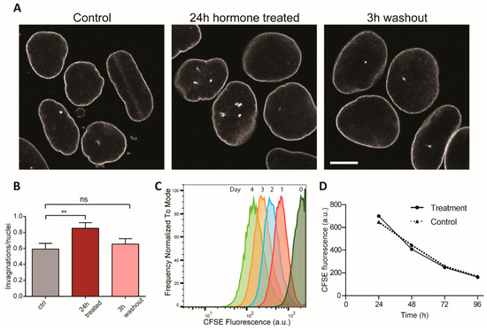 We then addressed whether the invaginations that formed under hormonal induction could be disassembled. We induced NR formation for 24 h with oestrogen and progesterone, then we removed the hormones and counted NR invaginations 3 h later. We found that after hormone removal NR levels rapidly returned to basal level seen prior to induction (Figure 3A,B). To ensure that the loss of NR complexity after hormone removal was not due to cell proliferation, we assessed cell division rates by flow cytometry after 5(6)-carboxyfluorescein N-hydroxysuccinimidyl ester (CFSE) labelling. A CFSE pulse stably labels cells and its fluorescence is halved at every cell division. We found that neither the addition nor the removal of hormones affects the rate of proliferation or the cell cycle stage distribution (Figure 3C and Figure S1). As CFSE fluorescence is halved every 30 h (Figure 3D), the reduction of NR abundance within 3 h of stimulus removal is cell division independent. This indicates that the invaginations of the nuclear envelope are both induced and stabilised during hormone exposure, while hormone removal rapidly reverses these effects and invaginations disappear.