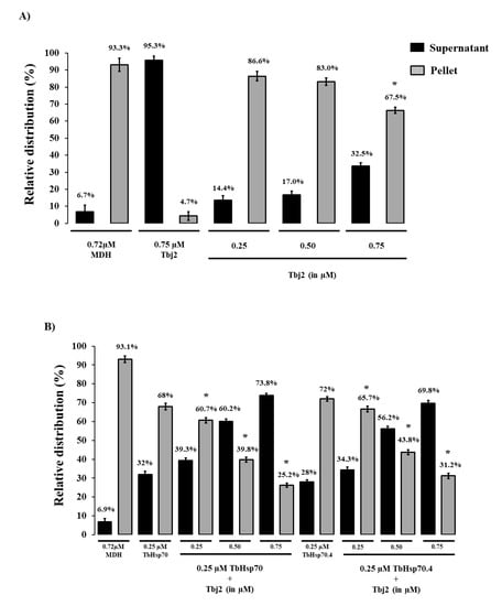 The capacity of TbHsp70 and TbHsp70.4 to suppress the thermally-induced aggregation of the model substrate, malate dehydrogenase (MDH) from porcine heart (Sigma-Aldrich, St. Louis, MO, USA.), alone or in the presence of Tbj2 was adapted from []. Briefly, the reaction was initiated by adding 0.72 µM MDH to varying concentrations of the T. brucei Hsp70s in assay buffer (50 mM Tris-HCl pH 7.4, 100 mM NaCl) either alone or in combination with Tbj2. The reaction was then heated at 48 °C for an hour. After incubation, the samples were centrifuged at 13,000× g for 10 min to separate the soluble and insoluble fractions. These fractions were analyzed using 10% SDS-PAGE, and subsequently quantified using densitometric analysis using the Image Lab v5.1 built 8 (Bio-Rad, Hercules, CA, USA). A negative control of BSA (0.75 µM) was added to illustrate that MDH-aggregation suppression was due to the holdase function of the T. brucei molecular chaperones and not simply due to the presence of a second protein in the assay system. As a control, the aggregation of the chaperones was monitored in the assay buffer without MDH. Each assay was conducted in triplicate and three independently purified batches of proteins were used.