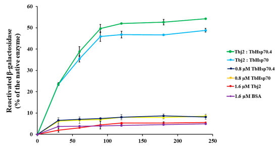 Tbj2 stimulates the refoldase activity of TbHsp70 and TbHsp70.4. Chemically-denatured β-galactosidase (3.4 nM) was diluted into refolding buffer containing the indicated Hsp70 and/or Tbj2 mixtures. β-galactosidase assays were performed as previously described []. Recovery of activity of denatured β-galactosidase by the various molecular chaperone mixtures was measured by its ability to convert substrate o-nitrophenyl-β-D-galactoside (ONPG) to yellow ortho-nitrophenol (ONP), and this absorbance was recorded at 420 nm. The negative control consisted of BSA (1.6 µM) added to denatured β-galactosidase enzyme to determine the kinetics of spontaneous refolding of the denatured β-galactosidase enzyme. Results are expressed as % β-galactosidase activity of the refolded enzyme in relation to native enzyme. Standard deviations were obtained from three replicate assays on three independent batches of purified protein.