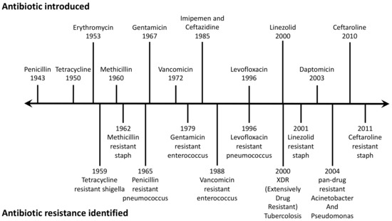 Unfortunately, the dawn of the antibiotic era has sadly corresponded to the rise of the phenomenon of antimicrobial resistance. It is widely accepted that, while the use of antimicrobial agents has led to the control and even eradication of infectious diseases, their misuse and/or overuse has led to the development of resistant strains. Based on his early observations, in 1954, Fleming had predicted that the inconsiderate use of this discovery could lead to the selection and propagation of selected mutants of bacteria resistant to antibiotics. Indeed, alarming signals of developing resistance were observed after only a few years of the golden age of antimicrobials [6] (Figure 1).