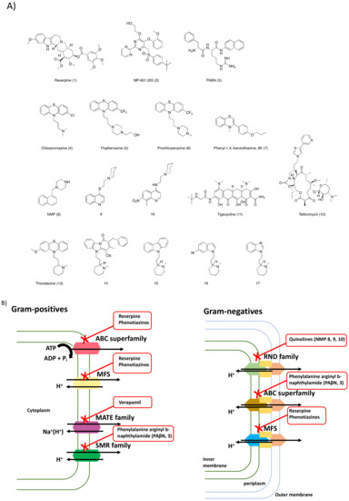 (A) Chemical structures of the efflux pump inhibitors (EPIs) discussed in this review and (B) efflux pumps expressed in Gram-positives and Gram-negatives bacteria and their respectively inhibitors.