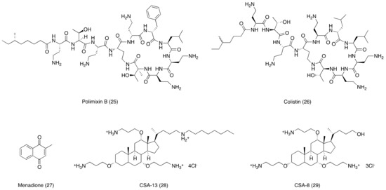The use of antibiotic adjuvants to increase the membrane permeability propensity (e.g., permeabilizer) proved to be a good strategy to improve the entrance of antibiotics. In general, permeabilizers are cationic and amphiphilic molecules or chelators that, by interacting with polyanionic lipopolysaccharides or by capturing outer layer cations, destabilize the membrane wall. Consequently, the outer membrane becomes more prone to being crossed by xenobiotic. Examples of outer membrane permeabilizers are polymyxins, such as polymyxin B (25, Figure 5), colistin (26, Figure 5), aminoglycosides, cationic peptides, cationic cholic acid derivatives, or polyamines [77,78].