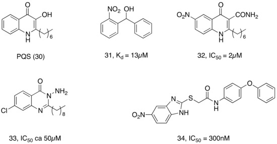- Ilangovan, A.; Fletcher, M.; Rampioni, G.; Pustelny, C.; Rumbaugh, K.; Heeb, S.; Cámara, M.; Truman, A.; Chhabra, S.R.; Emsley, J.; et al. Structural Basis for Native Agonist and Synthetic Inhibitor Recognition by the Pseudomonas aeruginosa Quorum Sensing Regulator PqsR (MvfR). PLoS Pathog. 2013, 9, e1003508. [Google Scholar] [CrossRef]