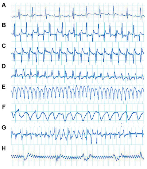 Electrocardiogram (ECG) tracings of rats with ventricular arrhythmias (VA) induced by BaCl2. The vertical axis of each ECG indicates voltage (mV), with 0.5 mV for all grids. The horizontal axis of the ECG indicates time (s), with 0.2 s for all four grids: (A) normal rat ECG tracing; (B) supraventricular tachycardia (SVT); (C) ventricular tachycardia (VT); (D) myocardial ischemia; (E) ventricular flutter; (F) ventricular fibrillation (VF); (G) different types of arrhythmias switching between each other; and (H) a terminal ECG.