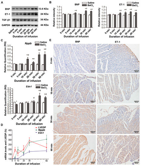 Expression of Endothelin-1 (ET-1), brain natriuretic peptide (BNP), and transforming growth factor-beta 1 (TGF-β1) in myocardial tissues after ventricular arrhythmia (VA). (A,B) BNP, ET-1, and TGF-β1 protein expression in myocardial tissues of rats after VA by western blot. (C) Expression of BNP mRNA (Nppb) and ET-1 mRNA (Edn1) in left ventricular myocardial tissues of rats after VA by real-time quantitative polymerase chain reaction (qPCR). (D) Correlation of left ventricular end-diastolic pressure (LVEDP) with Nppb and Edn1. The mean value of each indicator in the 0 min subgroup of the BaCl2 group was set as 100%. (E) Immunohistochemical (IHC) staining for BNP and ET-1 expression in rat myocardium of the BaCl2 subgroup. * p < 0.05, BaCl2 group vs. saline group in the same time subgroup. # p < 0.05, different time subgroups vs. 0 min subgroup in the BaCl2 group.