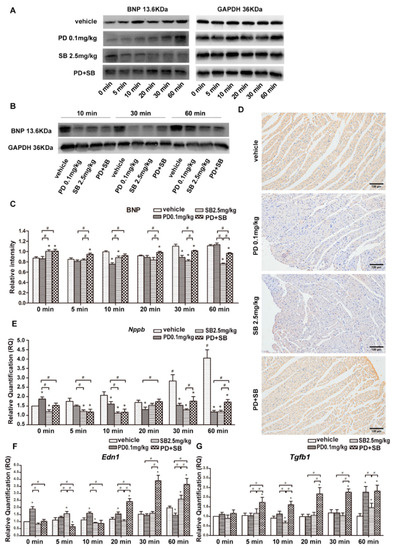 Expression of brain natriuretic peptide (BNP) protein after the application of inhibitors. (A,C) Western blot and column graphs of BNP protein in myocardial tissues of rats in the vehicle group. PD 0.1 mg/kg, SB 2.5 mg/kg, or PD+SB groups by western blot analysis. (B) Western blot of BNP protein in myocardial tissues of rats with ventricular arrhythmia (VA) at 10, 30, and 60 min after intraperitoneal injection of vehicle, PD 0.1 mg/kg, SB 2.5 mg/kg, or PD+SB before VA. (D) Immunohistochemical (IHC) staining for BNP in myocardial tissues of rats with VA 30 min after intraperitoneal injection of vehicle, PD 0.1 mg/kg, SB 2.5 mg/kg, or PD+SB before VA. (E–G) The expression of Nppb, Edn1, and Tgfb1 after the application of inhibitors by real-time quantitative polymerase chain reaction (qPCR). PD, PD142893; SB, SB431542. * p < 0.05, vs. vehicle group. # p < 0.05, vs. same timepoint subgroup.