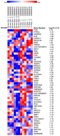 Based on their absolute values of LogFC, a total of 50 genes were selected from the DEGs, followed by analyzing with the Morpheus (https://software.broadinstitute.org/morpheus/) online software to construct the heat map (Figure 2) [9]. Furthermore, the biological processes functional enrichment and pathway enrichment analyses for DEGs were investigated using FunRich (http://www.funrich.org) software [10]. As shown in Figure S1a,b, the interactions nodes less than 10 were removed from group 1 and 2.
