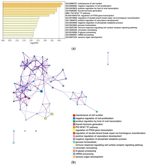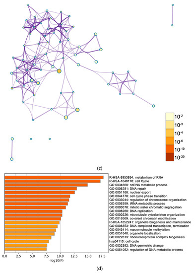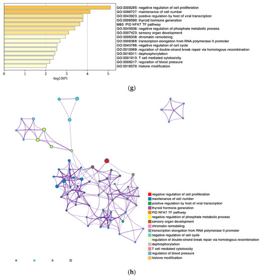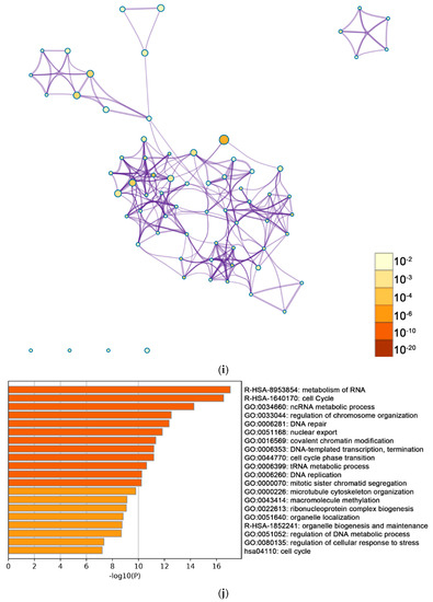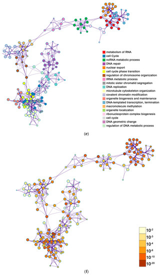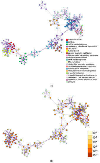 In group 1, the enrichment pathway of up-regulated genes mainly included maintenance of cell number and negative regulation of cell proliferation (Figure 3a), while the enrichment pathway of down-regulated genes mainly included metabolism of RNA, cell cycle, and ncRNA metabolic process (Figure 3d). In addition, the enriched terms were collected and listed based on their p-values and cluster (Figure 3b,c,e,f). For group 2, the significantly enriched pathways of up-regulated genes included maintenance of cell number and negative regulation of cell proliferation, whereas the enrichment pathway of down-regulated genes included metabolism of RNA, cell cycle, and ncRNA metabolic process. Enrichment processes were highly connected and aggregated together by p-value and clusters (Figure 3g–l).