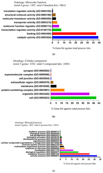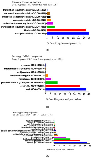 Moreover, the biological functions and pathways of DEGs were also investigated by using the PANTHER GO classification system, which consisted of three main gene ontology (GO) categories: Molecular function (MF), cellular component (CC), and biological process (BP). In group 1, for the MF, the main differential expression proteins were involved in catalytic activity (39.3%), binding (37.4%), and transcription regulator activity (7.6%) (Figure 4a). For the CC, the majority of proteins anticipated in processes such as cell (42.5%), organelle (36.1%), and protein-containing complex (12.8%) (Figure 4b). For the BP, proteins were associated with cellular process (32.2%), metabolic process (25.6%), and biological regulation (15.9%) (Figure 4c).