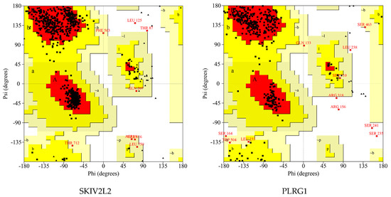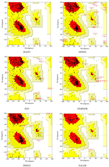 Ramachandran plots were drawn to evaluate the quality of protein models. As shown in Figure 5 and Table 5, these residues existed in outlier regions and ranged from 0% to 2.0% (SUGP1 0.0%, DHX16 2.0%, FUS 0.6%, HNRNPR 0.5%, DHX15 0.1%, NAA38 0.0%, SKIV2L2 0.2%, and PLRG1 1.4%), suggesting that the modeling quality of the protein is good.