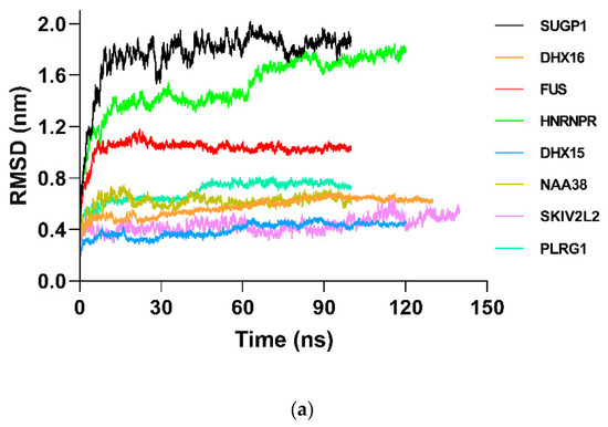 RMSD analysis was used to investigate the structure and dynamics of proteins. For the non-nsPEF treatment groups (Figure 6 and Table S1), backbone atoms started initial equilibration up to 5 ns (SUGP1 4.9 ns, DHX16 5.48 ns, FUS 5.36 ns, HNRNPR 5.16 ns, DHX15 5.12 ns, NAA38 5.36 ns, SKIV2L2 1.08 ns, and PLRG1 7.76 ns), and the protein structure started to converge after different times (SUGP1 5.00 ns, DHX16 5.50 ns, FUS 5.40 ns, HNRNPR 5.30 ns, DHX15 5.20 ns, NAA38 5.40 ns, SKIV2L2 1.10 ns, and PLRG1 7.80 ns). Subsequently, models showed stable conformation with an RMSD until the end of the MD production run (SUGP1 1.27–1.97, DHX16 0.48–0.68, FUS 0.98–1.18, HNRNPR 1.14–1.80, DHX15 0.32–0.44, NAA38 0.61–0.71, SKIV2L2 0.38–0.63, and PLRG1 0.58–0.75). For the nsPEF treatment groups, nsPEF application changed the protein atom movements, and this change enhanced with the increase of nsPEF intensity. Hence, these data suggest that the nsPEF markedly affects the atomic motion of the protein in a current intensity-dependent way.