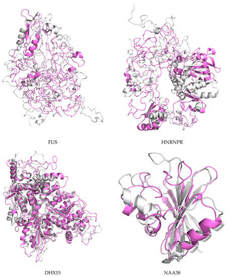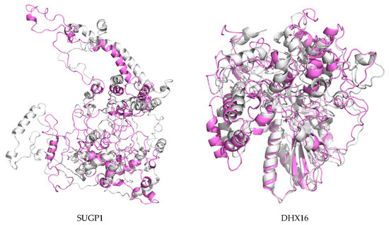 In order to construct the protein structure of the hub genes, 3D protein structures of hub genes were modeled with the Modeller (9v21) with multi-template-based protein modeling approaches. For all proteins, the 3D protein models were generated by homology modeling (except for SUGP1, FUS, HNRNPR, and NAA38) (Table 4). The best model for each protein with the lowest DOPE score (DHX16: −55625.39453; DHX15: −92022.80469; SKIV2L2: −118925.88281; and PLRG1: −41182.91406) was selected for further investigation.