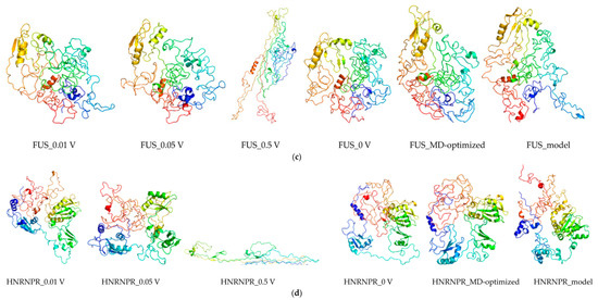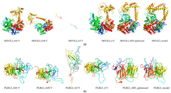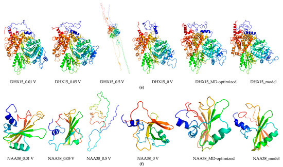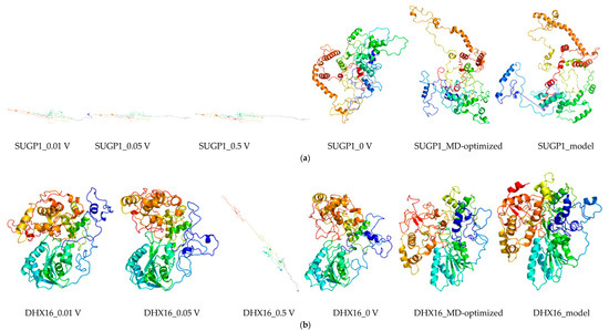 The structure of the 3D protein of hub proteins optimized by molecular dynamics. (a) SUGP1_model: the three-dimensional structure of the SUGP1 protein obtained by modeling; SUGP1_MD-optimized: after at least 100 ns molecular dynamics simulation, the lowest energy protein conformation of SUPG1 protein was obtained (based on the three-dimensional structure of the primary modeling) and was subsequently used for subsequent molecular dynamics simulations. After simulation of different electric field conditions, including 0 V (SUGP1_0 V), 0.01 V (SUGP1_0.01 V), 0.05 V (SUGP1_0.05 V) and 0.5 V (SUGP1_0.5 V), the lowest energy protein of SUGP1 protein were obtained respectively. Other proteins (b–h) were treated similarly to the SUPG1 protein. The pictures were drawn by the Visual Molecular Dynamics (VMD) software and the color map of the protein structure was shown in terms of protein secondary structure.