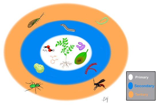 Just as induction of the SA pathway has primary metabolic consequences for the plant and secondary consequences for other organisms such as pests and pathogens, induction of the SA pathway can have tertiary effects on additional trophic levels affecting behavior and recruitment of natural enemies both aboveground and belowground.