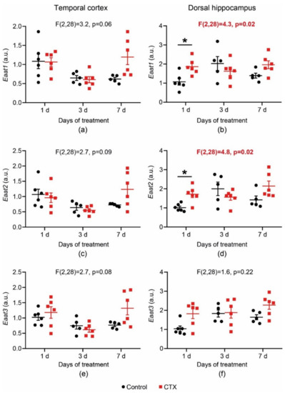 In the present study, we investigated the effects of CTX treatment (200 mg/kg, once per day) for 1, 3, and 7 days on the gene expression of two astrocytic transporters, Eaat1 and Eaat2, and a neuronal transporter, Eaat3, in the dorsal hippocampus and temporal cortex of 3-week-old male Wistar rats. The mRNA level of the genes of interest in brain tissue was evaluated by a real-time PCR assay performed the day after the last administration of CTX. To detect changes in glutamate transporter gene expression, a two-way analysis of variance (ANOVA) (number of days of treatment × drug) was used. The t-test with Bonferroni correction was utilized for post hoc analysis (Figure 1). The results revealed significant changes in the Eaat1 and Eaat2 mRNA level (Eaat1: F2,28 = 4.25, p = 0.024; Eaat2: F2,28 = 4.79; p = 0.016) in the dorsal hippocampus. The t-test with Bonferroni correction revealed an elevated mRNA level of Eaat1 and Eaat2 1 day post-CTX treatment (p < 0.05, Figure 1b,d, respectively). In the temporal cortex, as shown by the two-way ANOVA, there was no significant difference in Eaat1 and Eaat2 mRNA production (Figure 1a,c). No changes in the expression of the neuronal transporter Eaat3 were detected in either the temporal cortex or hippocampus (Figure 1e,f). Thus, the results revealed that CTX treatment induced only a small increase in gene expression of astrocytic transporters in the dorsal hippocampus. The maximum effect of CTX on transporter expression is observed after the first injection.