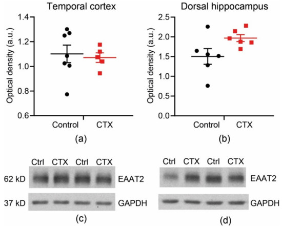 2.2. CTX Treatment Did Not Significantly Change the Protein Expression of EAAT2 in the Temporal Cortex and Dorsal Hippocampus