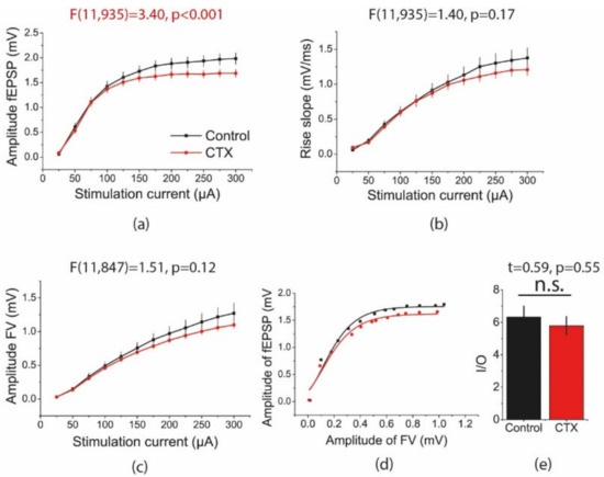 Next, to determine whether the efficacy of synaptic transmission changed after CTX treatment, the input/output (I/O) relationship between the fEPSP and FV amplitudes was determined for each slice (Figure 3d) and fitted with a sigmoidal Gompertz function (Equation (1)). The maximum slope of this fit reflected the composite cellular transfer function between the presynaptic action potentials and postsynaptic membrane response [43]. Therefore, the maximal I/O slope may be considered a measure of synaptic strength. There was no between-group difference in this parameter (control: 6.3 ± 0.7; n = 29; CTX: 5.8 ± 0.6; n = 47; t = 0.59; p = 0.55, Figure 3e).