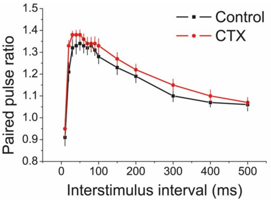 To determine whether CTX treatment affected the short-term synaptic plasticity, we used a paired-pulse protocol to measure the pair-pulse ratio (PPR) of the fEPSP amplitude (Figure 4). The PPR was determined using interpulse intervals in a range of 10 to 500 ms.