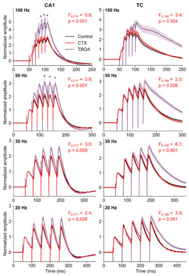 The summation of EPSPs in pyramidal neurons in hippocampus (CA1) and temporal cortex (TC). Graphs show averaged responses across all neurons (control, n = 12; CTX-treated, n = 14; TFB-TBOA, n = 12). A shadow represents the standard error of the mean. The effects of CTX treatment (CTX) and application of TFB-TBOA on the amplitude of EPSP summation was tested with a repeated measures ANOVA following Tukey’s HSD (honestly significant difference) post hoc test: *—p < 0.05 between control and TFB-TBOA-treated slices.