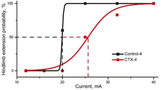 The MEST test was conducted next day after 4-day CTX administration. In the control-4 group, hindlimb extension occurred with 100% probability in response to a 25 mA-current, whereas a current with a stronger intensity was required to induce hindlimb extension in the CTX-4 group (Figure 7, Table A1). The EC50, calculated using the Boltzmann equation, was higher in the CTX-4 (25.6 ± 0.5 mA) group than in the control-4 (19.9 mA) group.
