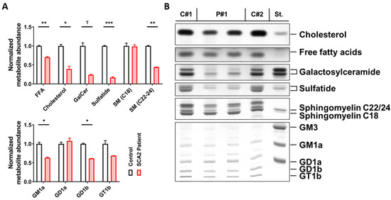 Cerebellar lipid profiles of one spinocerebellar ataxia type 2 (SCA2) patient. Technical duplicates (P#1 and P#2) were studied versus two age/sex-matched controls (C#1 and C#2) which were used to normalize all values. (A) Significant decreases in the abundance of free fatty acids, cholesterol, sulfatide, and very long-chain sphingomyelin (C22-24 SM) were observed in SCA2, and galactosylceramide (GalCer) appeared strongly reduced; for gangliosides, significant deficits in GM1a and GD1b were also observed. (B) Thin layer chromatography images of the lipid species analyzed in the adjacent bar graphs. Student’s t-tests were used with Welch’s correction; T p < 0.1, * p < 0.05, ** p < 0.01, *** p < 0.001.