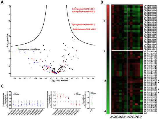 Consistently, the nervous tissue in cerebellum and in spinal cord showed lower amounts of free ceramide species. Specifically, in Atxn2-CAG100-KIN cerebellum (Figure 2) but also in the spinal cord (Figure S1), volcano plot analysis revealed all free ceramide species to have lower abundance regardless of chain length. In contrast, there was elevated abundance of sphingomyelins containing 12–22 carbon chain fatty acids (>30% increase) which were enriched in brain grey matter. Sphingomyelin species d18:1/22:1, d18:0/20:2, d18:0/22:3, and d18:1/20:0 showed a clearly significant upregulation in cerebellum upon volcano plot statistics, heat map analysis, and the visualization of variance. Interestingly, four sphingomyelin species containing 24–26 carbon fatty acid chains, which were enriched in brain white matter, showed consistent reduction to more than 30% in Atxn2-CAG100-KIN cerebellum (Figure 2A–C). These findings suggest that long-chain sphingomyelins accumulate in neurons, but the enzymatic elongation to the very long-chain sphingomyelin species required for myelination is impaired. Cerebellar levels of the angiogenesis and neurotrophin modulator sphingosine-1-phosphate (S1P) [99,100] were found significantly decreased to 44% upon Student’s t-test analysis, while volcano plot statistics showed a similar decrease without significance (Figure 2C). In the more severely affected spinal cord, S1P levels were at 81% without significance, while sphingosine was found accumulated to >230% with high significance upon volcano plot statistics (Figure S1).