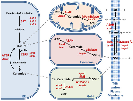 Schematic representation of ceramide–sphingomyelin metabolism modified after References [107,108]. The abbreviations together with information about differential cell type expression, subcellular localizations, and substrate preference for various enzyme isoforms are listed at the end of the article.