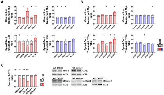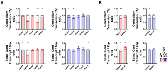 Transcript levels of the enzymes utilizing ceramide were studied in the cerebellum and spinal cord of Atxn2-CAG100-KIN and Atxn2-KO mice. (A) Expression levels of ceramidase isoforms involved in ceramide breakdown into sphingosine/sphinganine. (B) Expression levels of sphingomyelin synthase isoforms catalyzing the synthesis of sphingomyelin species utilizing ceramide. Student’s t-test was used with Welch’s correction; T p < 0.1, * p < 0.05, ** p < 0.01, **** p < 0.0001.