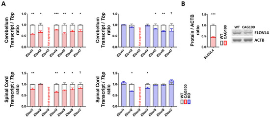 Strong and consistent downregulations were observed for elongase enzymes in the cerebellum and spinal cord of Atxn2-CAG100-KIN and Atxn2-KO mice which would affect synthesis of very long-chain fatty acids. (A) Transcript expression levels for different elongase isoforms. (B) Protein levels of ELOVL4 were documented in >12 month old Atxn2-CAG100-KIN cerebellum tissue. Student’s t-tests were used with Welch’s correction; T p < 0.1, * p < 0.05, ** p < 0.01, *** p < 0.001.
