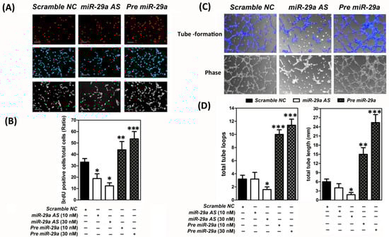 Next, we intended to explore the impact of miR-29a on modulation of angiogenic potential of endothelial cells in vitro. It is known that endothelial cells proliferation and capillary-like tube formation are the critical steps for the angiogenesis. We thus elucidated the gain or loss of function of miR-29a on these critical processes as the functional test. To perform the endothelial cells proliferation assay, synthetic miR-29a precursor (Pre-miR™ miRNA Precursor Molecules; Pre-miR29a), miR-29a antisense oligonucleotides (Anti-miR™ miRNA inhibitor; miR29a AS) or scrambled negative control (Scramble NC) were transected into human umbilical vein endothelial cells (HUVECs) for 48 h, respectively. Later, a bromodeoxyuridine 5-bromo-2′-deoxyuridine (BrdU; 100 µg/mL) was added to the culture media eight hours before cells were fixed for BrdU staining. BrdU-positive cells (with red nuclei) were stained by using a cell proliferation assay kit and defined as the neo-proliferating cells. As shown in Figure 2A,B, overexpression of miR-29a (Pre-miR29a group) apparently promoted cell proliferation of HUVECs, whereas knockdown of miR-29a (miR-29a AS group) notably reduced the endothelial cell proliferation, while compared to the cells transfected with scrambled negative controls (Scramble NC group). Further, we investigated the influence of miR-29a on capillary-like tube formation capacity. HUVECs were pre-transfected with scrambled NC, miR-29a antisense oligonucleotides, or miR-29a precursor for 48 h, respectively, and then the cells were seeded into a Matrigel–precoated 24-well plate (5 × 104 cells per well) to carry out in vitro tube-formation assays. As shown in Figure 2C, a dose-dependent augmentation pattern of tube-formational properties were shown when HUVECs were overexpressed with miR-29a. Forced introduction of miR-29a manifestly promoted HUVEC endothelial cells to form capillary-like hexagonal structures, which were defined as the positive tube formation (Figure 2C). The actual quantification of tube loops numbers and tube length were calculated by the Wimasis GmbH image analysis software (German; Website: www.wimasis.com) (Figure 2D). Forced expression of miR-29a markedly enhanced the total loops from 5.73 ± 0.87 (Scramble NC group) to 9.16 ± 1.34 (Pre-miR29a; 10 nM) and 11.09 ± 1.75 (Pre-miR29a; 30 nM) and promoted total tube length from 12.72 ± 1.28 (Scramble NC; 30 nM) to 14.22 ± 1.59 mm (Pre-miR29a; 10 nM) and 25.39 ± 2.83 (Pre-miR29a; 30 nM) (Figure 2D). In contrast, diminishment of miR-29a in HUVECs vastly decreased total loops from 5.73 ± 0.87 (Scramble NC; 30 nM) to 3.67 ± 0.98 (miR-29a AS; 10 nM) and 1.73 ± 0.34 (miR-29a AS; 30 nM); declined total tube length from 12.72 ± 1.28 (Scramble NC; 30 nM) to 9.58 ± 1.31 (miR-29a AS; 10 nM) and 4.37 ± 0.77 (miR-29a AS; 30 nM) (Figure 2D). These data provided substantial evidence to support that miR-29a was a pro-angiogenic microRNA and displayed imperative roles on regulation of several crucial steps of angiogenesis including enhancing the capacities of endothelial cell proliferation and inducing the capillary-like tube formation.