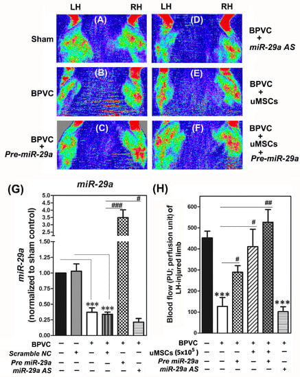 Forced expression of miR-29a or transplantation of human umbilical cord Wharton’s jelly (WJ)-derived mesenchymal stem cells (uMSCs) successfully restored the blood perfusion in the anesthetized C57BL/6 mice post BPVC-injury (n = 6/each group). Representative laser Doppler perfusion images of both left hind (LH) and right hind (RH) limbs. After 7 days of BPVC injury on the LH limb, impaired blood perfusion was shown in ((B); LH site), while compared to the saline injected LH limb Sham group (A) or its contralateral control RH limb ((B); RH site). Injection of Pre miR-29a notably rescued the BPVC-suppressed blood perfusion in LH limb ((C); LH site) whereas the injection of scramble NC (negative control of miR-29a) into the RH limb did not have any significant restoration on perfusion recovery ((C); RH site). (D) Injection of miR-29a AS (inhibitor of miR-29a) into BPVC-induced ischemic LH limb aggravated the impairment of blood perfusion. (E) Transplantation of uMSCs into BPVC-injured LH limbs considerably restored the perfusion while compared to the BPVC-injured LH limb in ((B); LH site). Of note, transplantation of uMSCs together with Pre miR-29a conspicuously renovated the BPVC-induced LH limb ischemic perfusion and shown in (F). (G) Quantitative RT-PCR analysis confirmed that Pre miR-29a injection group strongly displayed miR-29a transcripts in gastrocnemius muscles collected from ((C); LH site) than those in the scramble NC treatment group collect from ((C); RH site). In contrast, the level of miR-29a was evidently suppressed in the miR-29a AS treatment groups shown in ((D); LH site) than those in scramble NC group shown in ((D); RH site). (H) Histograms showed the quantification of blood flow perfusion unit (PU) per field which underwent saline-or BPVC injection, Pre miR-29a or miR-29a AS administration, transplantation of uMSCs, and combination of Pre miR-29a and the uMSCs treatments post BPVC injury. Data were given as means ± SD; *** p < 0.001 for the BPVC group vs. the Sham group or the BPVC + scramble NC group vs. Sham + scramble NC group; # p < 0.05, ## p < 0.01, ### p < 0.001 for the BPVC group vs. the Sham group; * p < 0.05 for the BPVC + Pre miR-29a group, BPVC + the miR-29a AS group, the BPVC + uMSC group, the BPVC + uMSC + Pre miR-29a group vs. the BPVC group.
