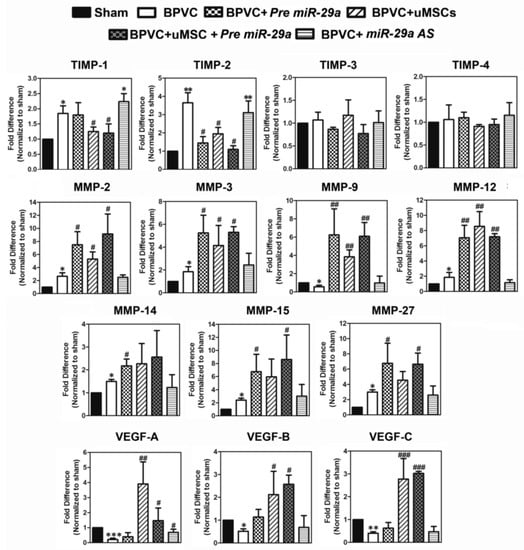 Effects of exogenously introduction of miR-29a or transplantation of uMSCs on the expression of mouse tissue inhibitors of metalloproteinases (TIMPs), matrix metalloproteinases (MMPs), and vascular endothelial growth factors (VEGF) in isolated gastrocnemius muscles underwent BPVC-induced ischemic injury. Tissue extracts were collected from gastrocnemius muscles on day 7 post saline or BPVC injection, or after four days of Pre miR-29a, miR-29a AS, and uMSC transplantation 72 h following BPVC-injection. The protein levels of anti-angiogenic factors TIMPs and known pro-angiogenic factors MMPs and VEGFs, responsible for cleaving various extracellular proteins to enhance the tube formation and promote vascular development, with each group of mice were determined using the Quantibody Mouse Angiogenesis Array (n = 6/group). Data were given as means ± SD; * p < 0.05, ** p < 0.01, *** p < 0.001 for the BPVC group vs. the Sham group; # p < 0.05, ## p < 0.01, ### p < 0.001 for the BPVC group vs. the Sham group; * p < 0.05, ** p < 0.01 for the BPVC + Pre miR-29a group, the BPVC + miR-29a AS group, the BPVC + uMSC group, the BPVC + uMSC + Pre miR-29a group vs. the BPVC group.