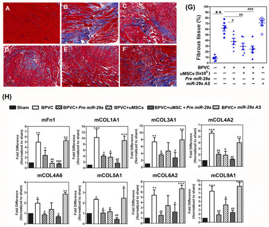 2.4. Forced Expression of miR-29a or Transplantation of the uMSCs Exhibited the Anti-Fibrotic Properties in Vivo and Alleviated BPVC-Induced Gastrocnemius Muscle Fibrosis