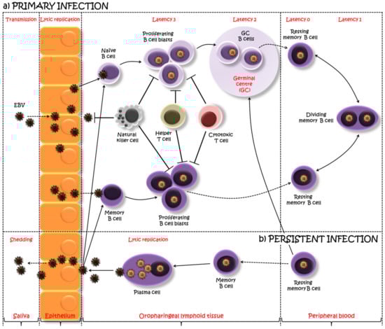 A model of Epstein–Barr virus (EBV) primary and persistent infection. EBV, transmitted via saliva, lytically replicates, possibly in the oropharyngeal epithelium, after which the virus spreads throughout the lymphoid tissues and infects underlying B cells. One viewpoint proposes that EBV infects tonsilar naïve B cells turning them into latently infected proliferating B cell blasts, using the growth program or latency 3, and expressing a full spectrum of latent proteins. The majority of these proliferating cells are removed by natural killer and T cell response. However, the surviving B cell blasts undergo a germinal center (GC) reaction, where a more limited set of viral genes are expressed (the default program or latency 2). The viral persistence is realized through the silent infection of B cells when EBV-infected GC B cells migrate to peripheral blood establishing a stable reservoir of resting memory B cells, in which no EBV gene is expressed (latency program or latency 0). Intermittent expression of EBNA1 during the division of these memory B cells allows the viral genome to be distributed to the daughter memory B cells (EBNA1 only program or latency 1). An alternative viewpoint suggests infection of pre-existing memory B cells as a direct route into the memory B cell reservoir. Occasionally, these EBV-infected cells might be recruited into GC reactions, after which they might either re-enter the reservoir as memory B cells or return to the lymphoid tissue and undergo plasma cell differentiation, activating the viral lytic cycle. This allows the EBV replication, shedding into saliva and transmission both to new hosts and to previously uninfected naïve B cells within the same host. Adapted from [,].