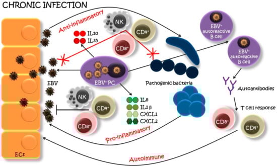 Second, it was shown that EBV+ PCs grouped together to form high-density EBV+ cell clusters scattered within the infiltrate in close contact with neighboring tissues [,]. A working hypothesis is that the infiltration of EBV+ PCs and the massive production of EBV virions in the inflammatory region may favor extensive infection of the ECs, as well as B cells, promoting a self-amplifying process of EBV infection within the inflammatory lesions. In that context, infection and destruction of epithelia by EBV are very likely, taking into account that EBV entry in polarized ECs is favored by close contact with EBV-producing PCs []. These infected oral epithelial tissues, in turn, may represent a reservoir for further intense EBV replication and EBV shedding in saliva and spreading to distant sites.