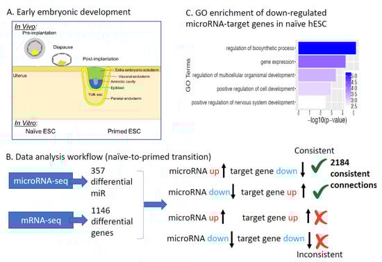 microRNAs regulating human naïve to primed ESCs transition: (A) A schematic figure of early embryonic developmental stages. (B) Analysis workflow. We first identified 357 differentially expressed microRNAs and 1146 differentially expressed protein-coding genes in two naïve-primed studies [27,45]. We then used mirTarBase to connect changes in microRNA and their experimentally validated target genes, and filtered down to 2184 miR-target gene connections where microRNA is up and its target is down (or vice versa). Green √ means the microRNA-gene connection is considered consistent; red × means the connection is not consistent. (C) Gene ontology enrichment of microRNA target genes with lower expression in human naïve ESCs (the microRNA regulators are higher in naïve). x-axis is negative log10 of enrichment p-value (larger means more significant).
